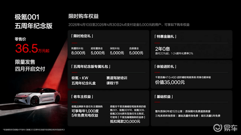 易车讯 4月10日,极氪001五周年版正式上市,售价36.5万元起,新车限量发售,将于4月开启交付。新车为极氪品牌五周年之际特别推出的限定版本,将搭载900V纯电平台架构、KW高性能绞牙避震,星空音乐厅座舱。